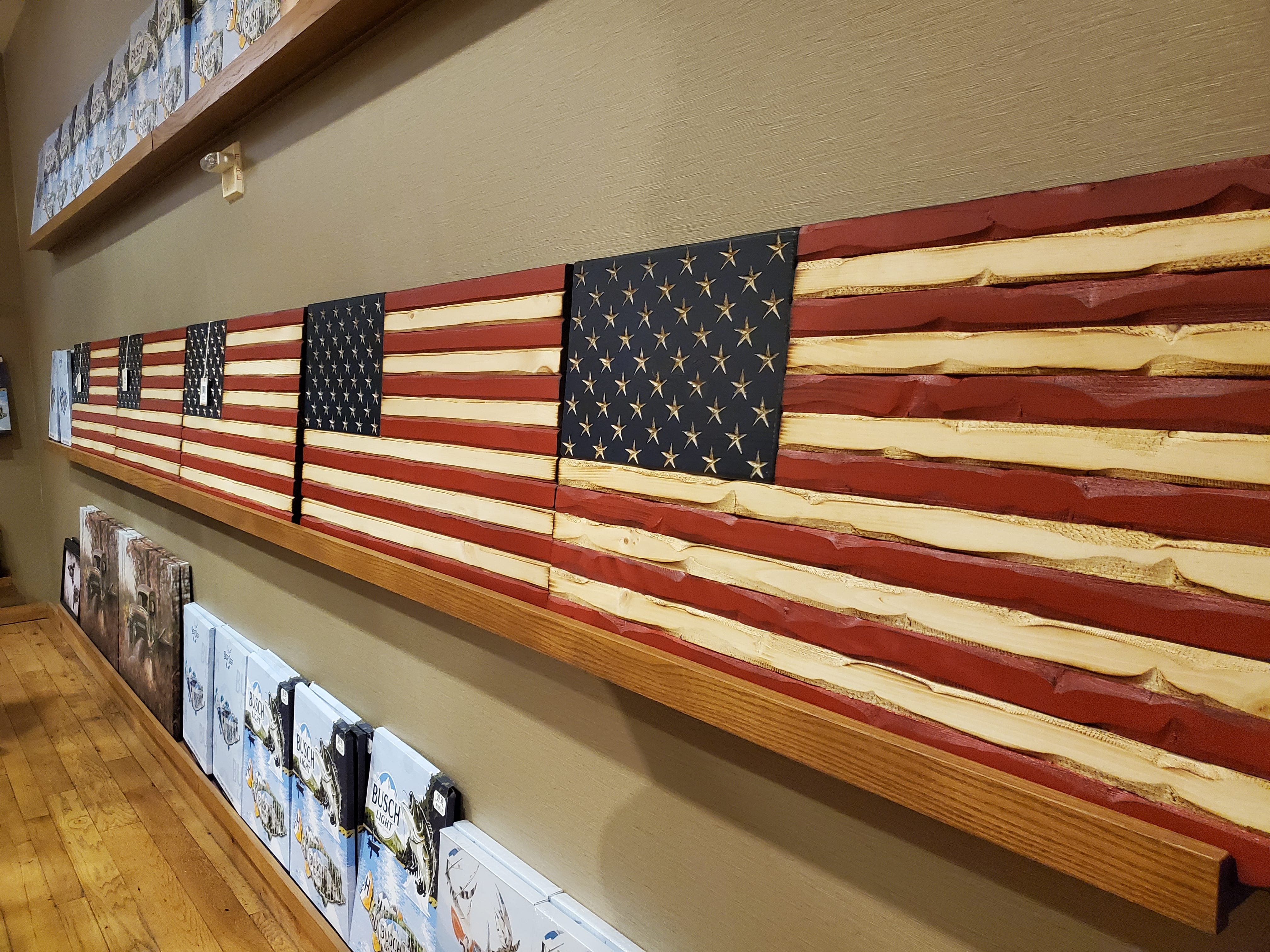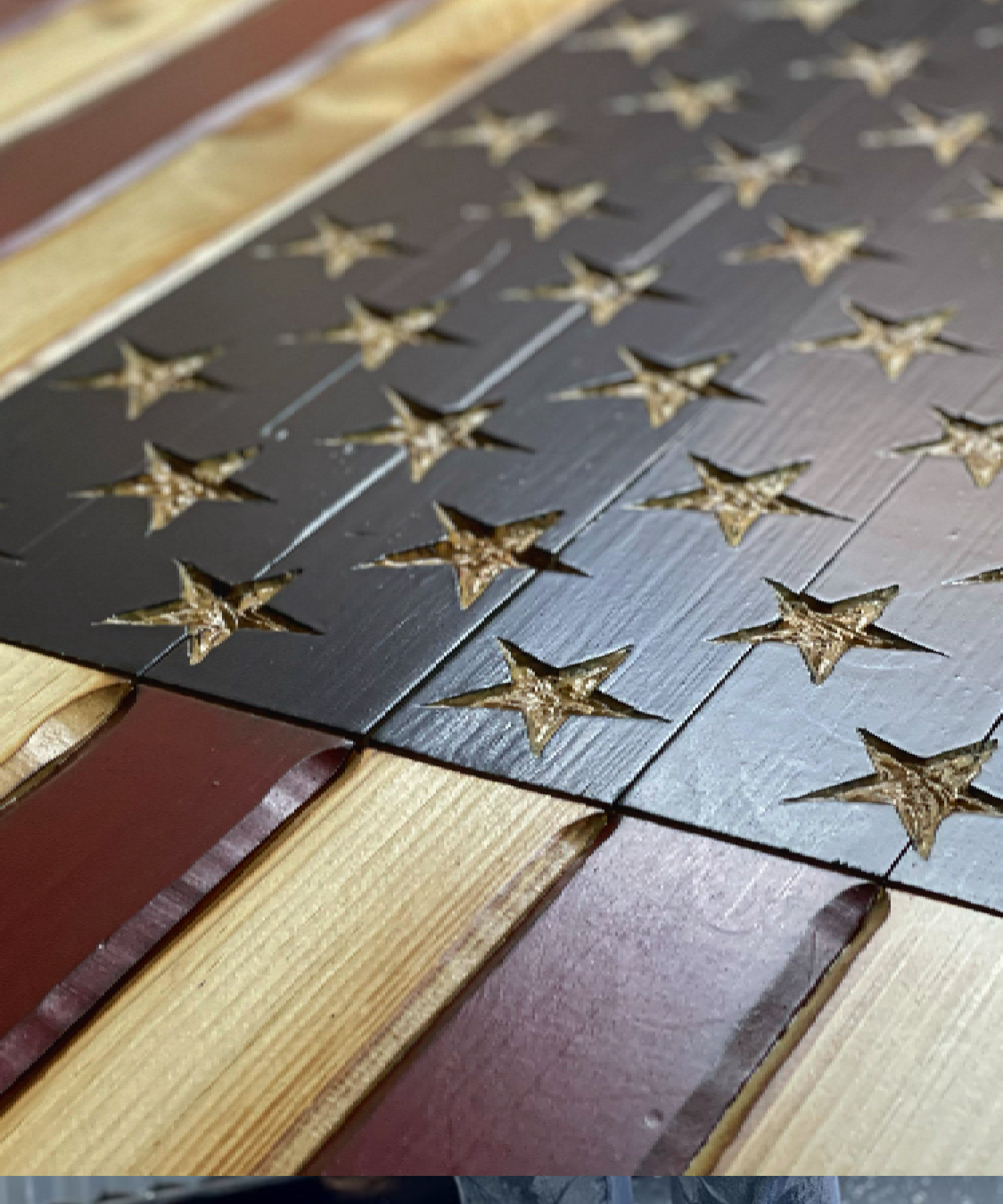 Our Flags are forged through fire and crafted with precision. Each strip of wood is hand-carved to reveal its raw power and enhanced through our aging process. We don't just assemble wood, we carve with intensity and precision, creating a one-of-a-kind masterpiece. We're the pioneers of a revolutionary technique that combines computer precision for stenciling with traditional hand carving , ensuring that every flag we produce is a fierce, unique work of art.
